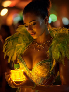 The image features an illustrated bottle of Birkholz perfume labeled "Sol E Samba eau de parfum." The background includes vibrant elements such as a sun, a woman in festive attire with a feathered headdress, a lime and an orange, colorful houses on a hillside, and the iconic Christ the Redeemer statue, suggesting a Brazilian theme.