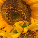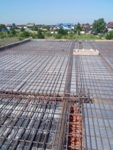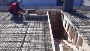 The image shows a construction site where workers are pouring and spreading concrete over a large foundation with rebar mesh. A cement mixer truck is positioned on the right side, continuously dispensing concrete. Several residential houses and a field with yellow flowers can be seen in the background. The site is enclosed by concrete walls and wooden formwork.